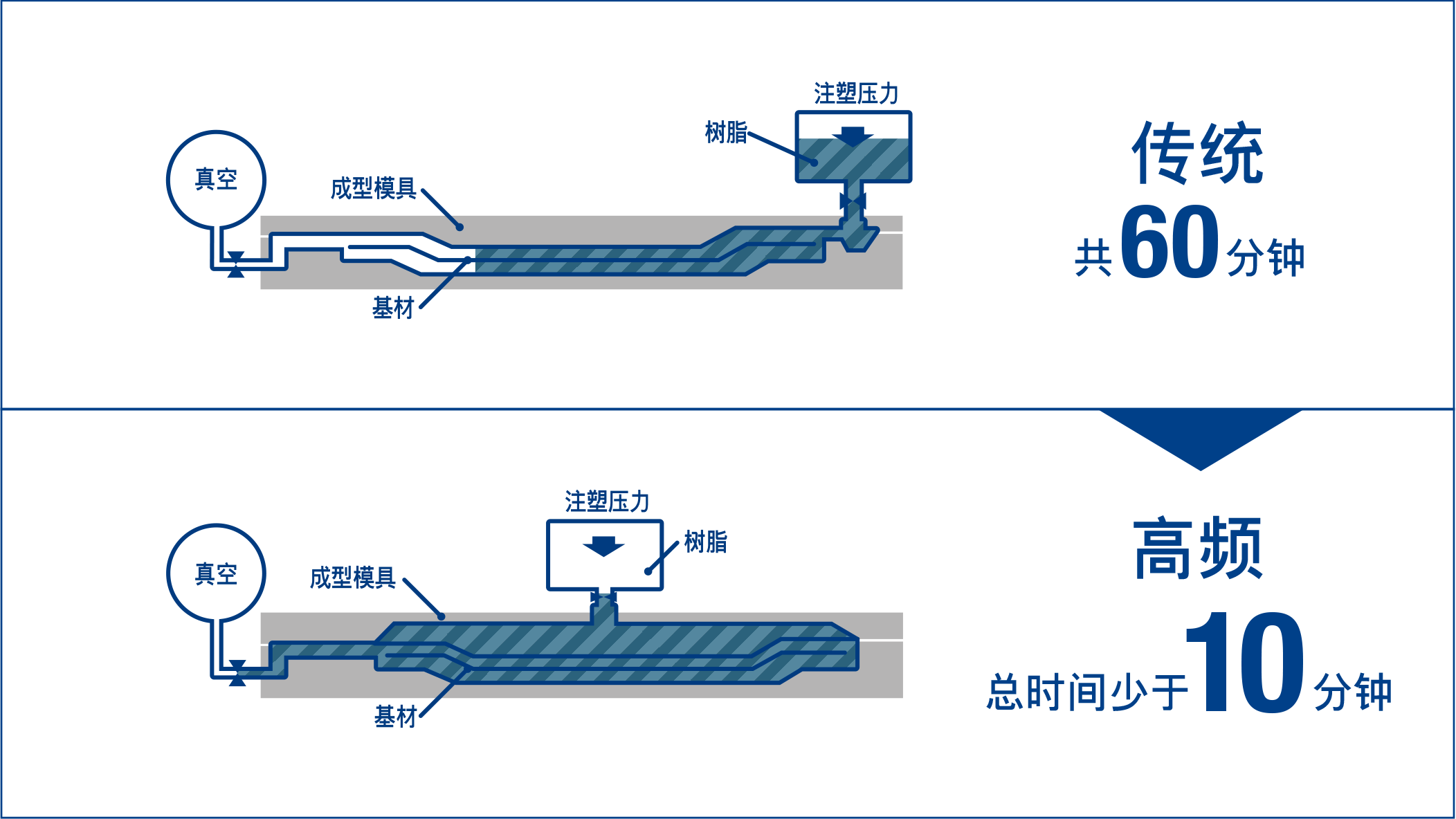 作为热固性CFRP成形技术之一的“RTM成形法”,为了实现成型周期的高速循环,成型时采用通过多点注入法的高速树脂浸润技术及超高速固化树脂技术,可使时间大幅缩短。