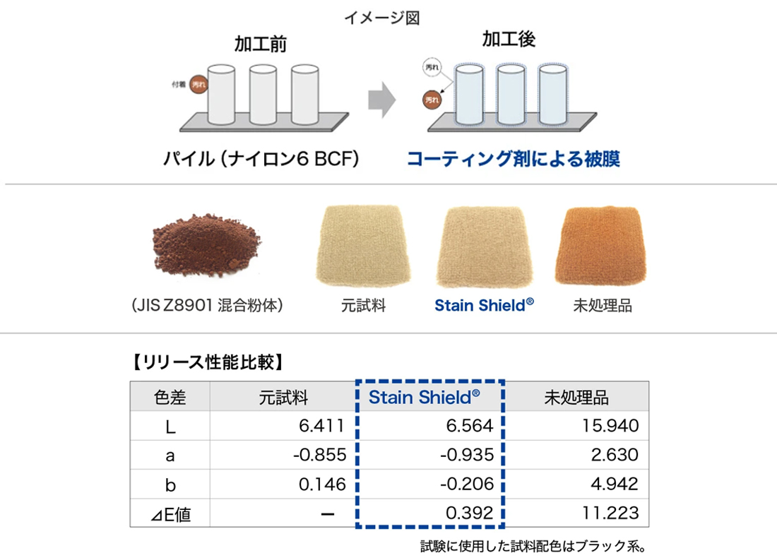 高離型性を有する特殊なコーティング剤を、表面だけでなくパイルの根本まで被膜しています。これにより、汚れが付着しにくく除去しやすい、高いメンテナンス性があります。