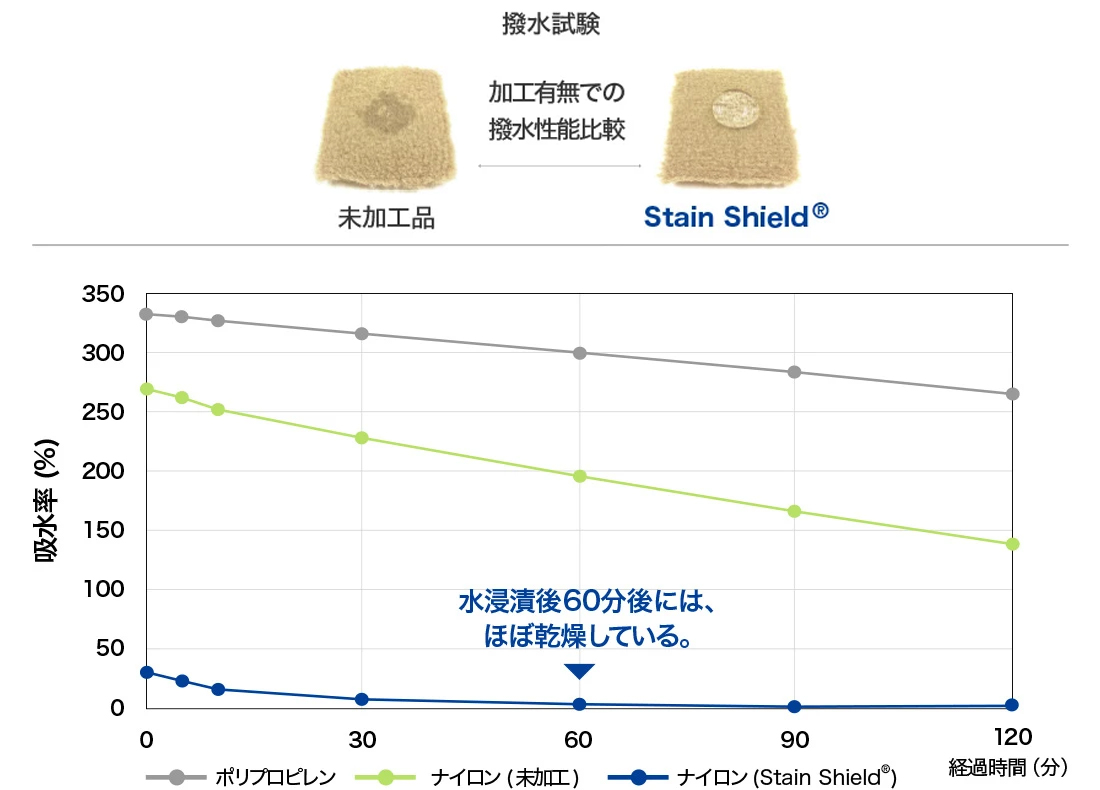 砂などの乾いた汚れが付着しにくく取れやすいだけでなく、液体汚れを表面で弾き、繊維に浸透する前に拭き取ることができます。