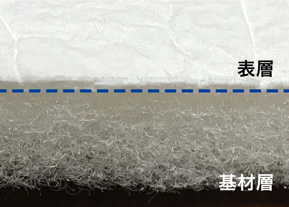 細い繊維と太い繊維の2層積層構造により、単層吸音材では吸音が難しい1,000~2,000Hzの高級音性能を実現させました。