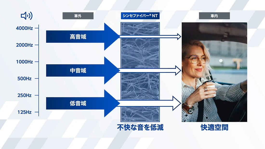 シンセファイバー™ NTは低〜中周波数の吸音性に優れ、ロードノイズなどの騒音を大幅にカットします。従来吸音することが難しかった1,000Hzの領域の音源を吸収することを可能にします。