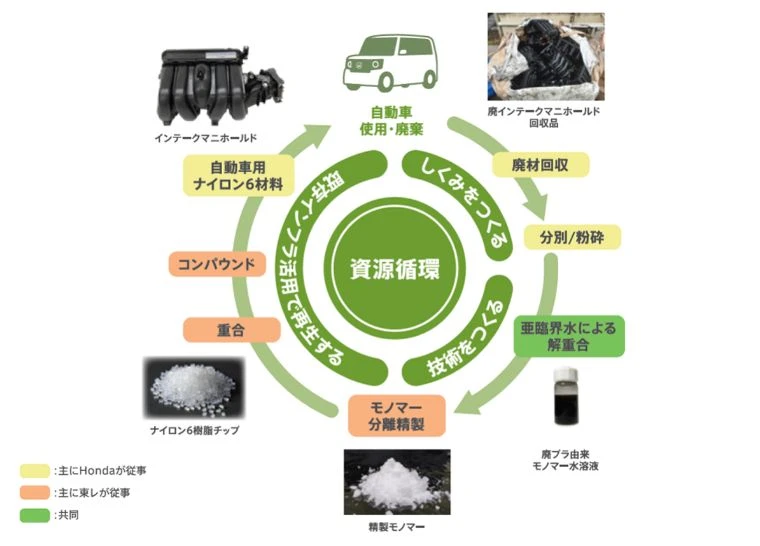 亜臨界水解重合技術により、自動車用PA6樹脂のケミカルリサイクルを実現します。これまで廃棄されていた自動車部品の資源循環が可能となり、二酸化炭素排出量の削減に貢献します。